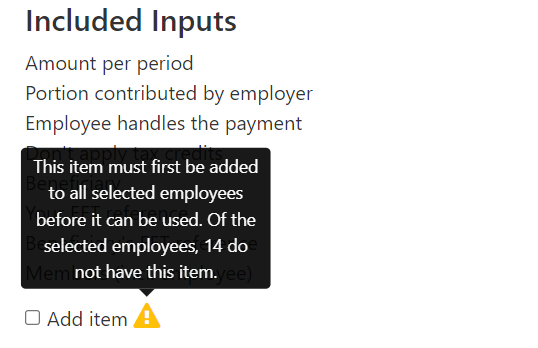 • Select the Add Item checkbox after viewing the Included Inputs. You may add as many items as you like.
