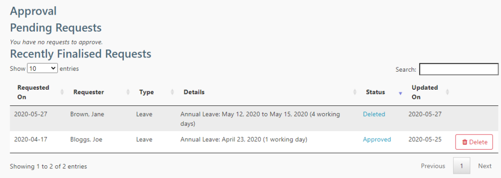 - If the Retain these leave dates? box is unchecked when clicking Delete Request, then the leave request will be deleted, and the leave days that form part of the request will be deleted from the calendar and added back to the leave balance for that leave type.