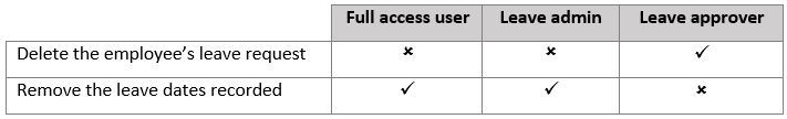 Leave can be deleted in two ways, depending on the permission role that you are assigned: